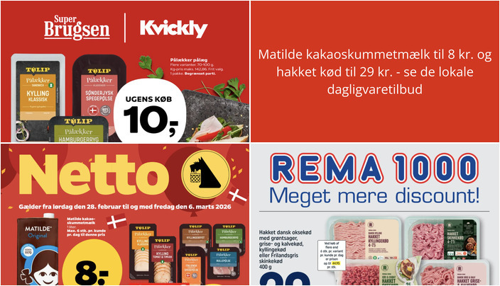 Netto tilbyder Matilde kakaoskummetmælk til en pris af kun 8 kr. pr. liter. Du kan maksimalt købe 6 stk. pr. kunde pr. dag til denne pris. Tilbuddet gælder fra lørdag den 28. februar til fredag den 6. marts.